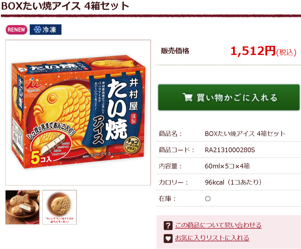 ネットで「たい焼きアイス」が売ってないとの投稿を見かけたのですが、こちらの井村屋ウェブショップで購入できます。